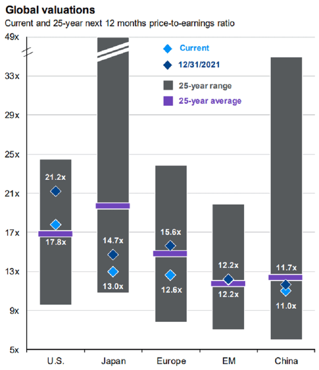 Die Bewertungen der Aktien der Schwellenländer weichen nicht wesentlich von ihren langfristigen Durchschnittswerten ab. Sowohl japanische als auch europäische Aktien scheinen weiterhin interessant bewertet zu sein. Die europäischen und japanischen Kurs-Gewinn-Verhältnisse liegen jetzt bei 12,6 bzw. 13, während die Durchschnittswerte der letzten 25 Jahre bei etwa 15 bzw. 20 liegen.