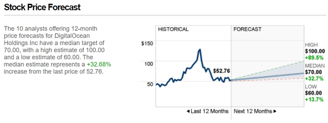 Trotz der starken Konkurrenz durch viel größere Anbieter wächst DigitalOcean in einem angemessenen Tempo. Im vergangenen Jahr erreichte das Unternehmen 609.000 Kunden, was einem Anstieg von 6 % entspricht, und der durchschnittliche Kunde gab 16 % mehr aus, was ein Beweis für die Beständigkeit der Plattform ist. Der Umsatz wiederum stieg um 35 % auf 429 Mio. USD, und das Unternehmen erwirtschaftete einen positiven FCF von 24 Mio. USD, verglichen mit einem Verlust von 58 Mio. USD im Vorjahr.