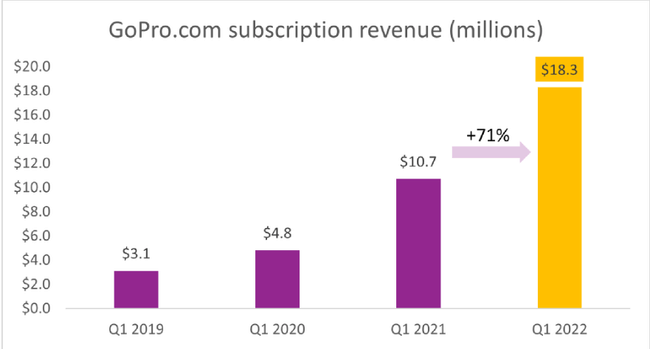 Die größte wiederkehrende Einnahmequelle von GoPro ist jedoch das GoPro.com-Abonnement, das den Kunden exklusive Rabatte auf Produkte, Cloud-Speicher für Videos und die Möglichkeit zum Live-Streaming von ihrem GoPro-Gerät bietet. Im ersten Quartal setzte das Unternehmen sein fulminantes Wachstum fort: Die Zahl der Abonnenten stieg im Vergleich zum Vorjahr um 85 % auf 1,74 Millionen, was zu einem Anstieg der Abonnementeinnahmen führte.