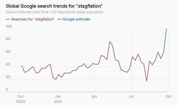 Auf der einen Seite haben wir als Überbleibsel der Pandemie eine höhere Arbeitslosigkeit in Verbindung mit einer steigenden Inflation, die zum Teil auf das Gelddrucken und zum Teil auf die erhöhte Nachfrage nach Gütern zurückzuführen ist, die wiederum aufgrund von Komplikationen in der globalen Lieferkette knapp sind. Dies ist an sich noch keine kritische Situation. Was jedoch in letzter Zeit den Begriff Stagflation nicht nur in der Wirtschaftsdiskussion, sondern sogar in der Google-Suche "wiederbelebt" hat, sind die rasch steigenden Öl- und Gaspreise.