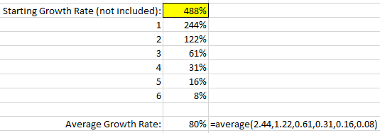 - Bei der aktuellen Bewertung wird davon ausgegangen, dass die Wachstumsrate von Tesla über sieben Jahre 54 % beträgt. Unter der Annahme, dass die Wachstumsrate fünf Jahre lang um 50 % pro Jahr sinkt, würden wir ausgehend vom aktuellen Kurs von 488 eine durchschnittliche Wachstumsrate von 80 % erhalten.