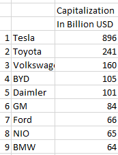 Tesla hat allen Annahmen getrotzt und ist in vielen verschiedenen Bereichen weltweit führend. Der Markt hat Tesla reichlich belohnt und dem Unternehmen eine höhere Kapitalisierung verliehen als allen anderen 8 Wettbewerbern zusammen, wie die folgende Grafik zeigt. Das mag heute natürlich völlig verrückt erscheinen, aber nach der folgenden Analyse bin ich davon überzeugt, dass es sich eher um eine Unterbewertung der anderen Autohersteller als um eine Überbewertung von Tesla $TSLA handelt. Tesla ist definitiv ein ganzes Stück voraus, aber ich denke, dass seine Bewertung langfristig gerechtfertigt sein kann.