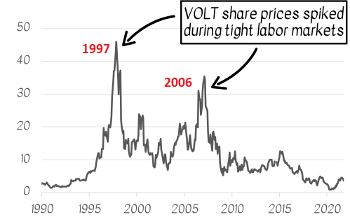 Das liegt daran, dass diese Unternehmen in vielerlei Hinsicht den Öl- und Gasunternehmen ähneln - sie haben niedrige Gewinnspannen, sind stark auf Rohstoffe ausgerichtet und von den Marktzyklen abhängig. Volt Information Science $VOLT wurde während der Technologieblase von 1997 bis zu 44 $ und während der Immobilienblase von 2006 bis zu 40 $ gehandelt, bevor es auf das heutige Niveau von unter 4 $ abstürzte.