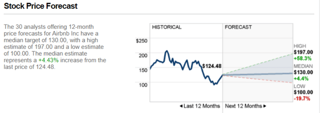 - Der heutige Kurs der $ABNB-Aktie liegt bei 124 $, was angesichts der Prognosen der Analysten, die ein durchschnittliches Kursziel von 130 $ pro Aktie sehen, nicht gerade attraktiv erscheint. Im besten Fall erwarten sie also bis zu 197 Dollar, aber das ist meiner Meinung nach eine andere Welt, und ich wäre nicht geneigt, dort hinzugehen (zumindest nicht dieses Jahr).