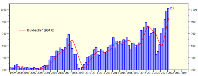 Eine weitere Hürde für Aktien ist die Verlangsamung der Unternehmensrückkäufe, die in diesem Jahr bisher einen Rekordwert erreicht haben. Obwohl die Rückkaufermächtigungen 2022 um 18% auf 856 Mrd. $ anstiegen, sanken die tatsächlichen Ausgaben für Aktienrückkäufe im zweiten Quartal um 21% im Vergleich zum ersten Quartal, schreiben die Strategen der Goldman Sachs Group Inc.