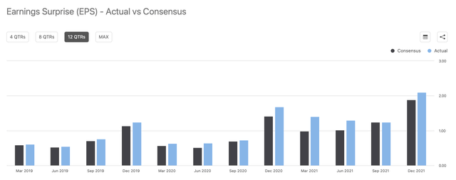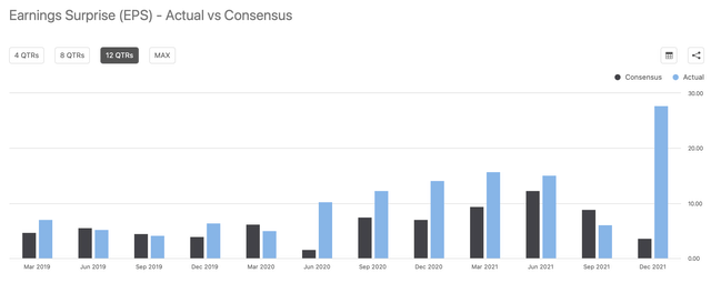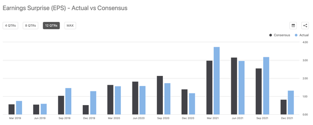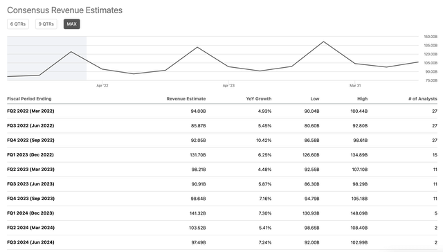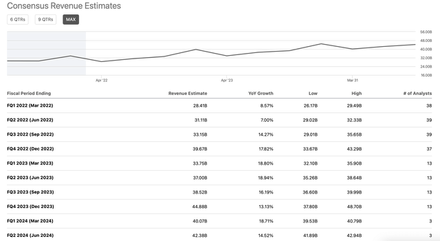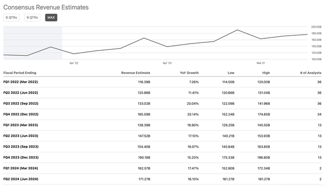 Wir können sehen, dass das Ertragspotenzial von Amazon ziemlich bemerkenswert ist. Der Gewinn pro Aktie des Unternehmens ist nicht annähernd so hoch, wie er sein könnte, weil Amazon ständig auf Wachstum ausgerichtet ist. Sobald das Unternehmen seine volle Reife erlangt hat, wird es wahrscheinlich einen beachtlichen Shareholder Value generieren. Im Moment sehen wir jedoch, dass Amazon noch viel Wachstum vor sich hat, da das Unternehmen auch in den kommenden Quartalen ein Umsatzwachstum von 15-20 % erzielen dürfte.