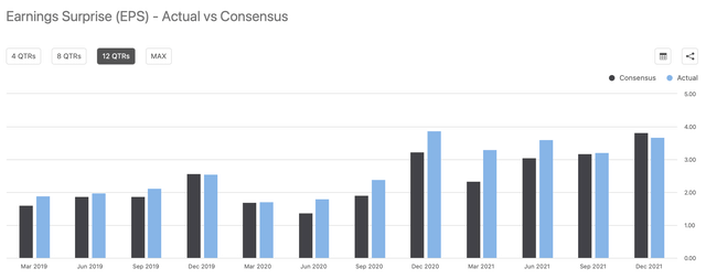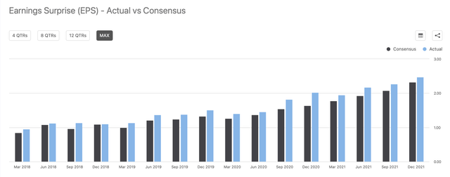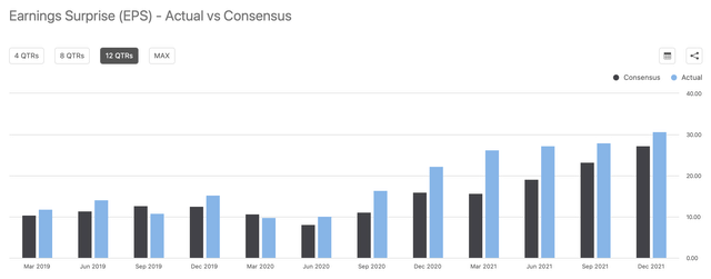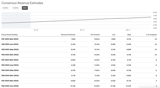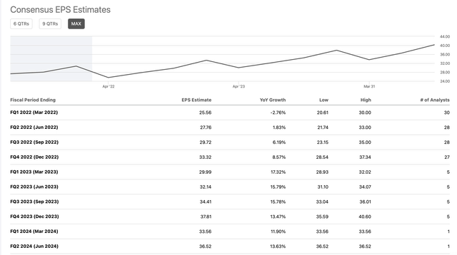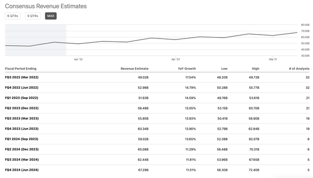 Microsoft hat in den vergangenen Jahren ein robustes Ertragswachstum gezeigt, und mit dem Fortschreiten des Unternehmens dürfte sich das Ertragswachstum fortsetzen. Auch wenn sich das Gewinnwachstum des Unternehmens von 20 % verlangsamen sollte, dürften wir in den kommenden Quartalen immer noch ein Gewinnwachstum von 10-15 % sehen.