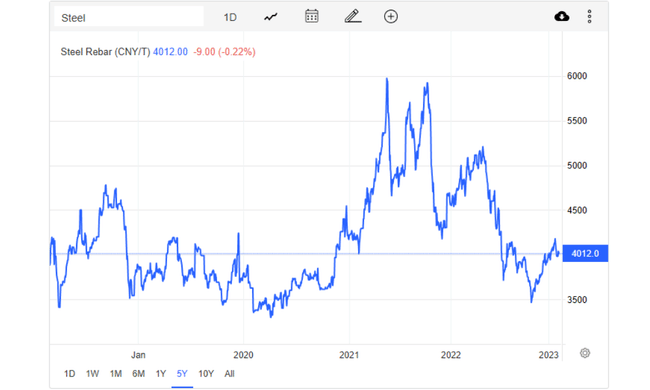 Um die Zyklizität aufzuzeigen, müssen wir auch das Gesamtbild der Rohstoffpreise kennen, insbesondere Stahl ist einer der wichtigsten Rohstoffe für dieses Unternehmen. Wie Sie sehen können, war die buchstäbliche Explosion im Jahr 2021 ziemlich schockierend, während wir uns derzeit in einem solchen Durchschnitt befinden, wenn man das Diagramm mit einer größeren Zeitspanne betrachtet.