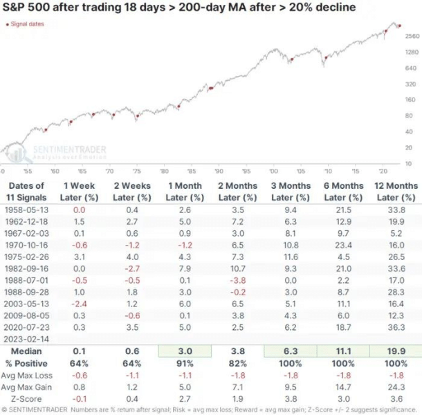Bei der Betrachtung des S&P 500 Index seit 1950 wurden folgende Parameter verwendet: Der Index muss um mehr als 20 % gefallen sein (was bedeutet, dass er sich in einem Bärenmarkt befindet) und dann 18 oder mehr aufeinander folgende Tage über seinem gleitenden 200-Tage-Durchschnitt gehandelt haben.