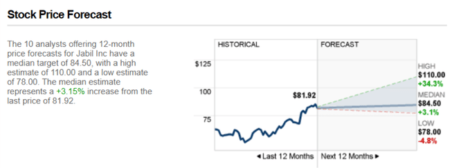 Die 10 Analysten, die 12-monatige Kursprognosen für Jabil Inc. abgeben, haben ein mittleres Kursziel von 84,50, mit einer hohen Schätzung von 110,00 und einer niedrigen Schätzung von 78,00. Die mittlere Schätzung entspricht einem Anstieg von +3,15% gegenüber dem letzten Kurs von 81,92.