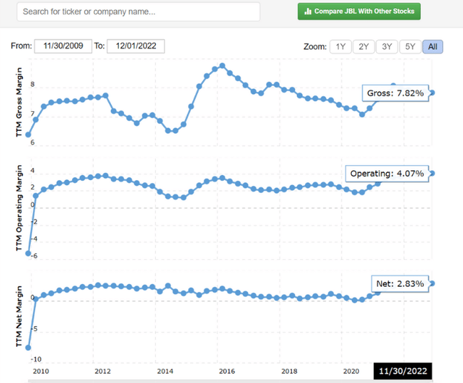 Die durchschnittliche jährliche Wachstumsrate des Nettogewinns von Jabil betrug in diesem Zeitraum 50,4%.