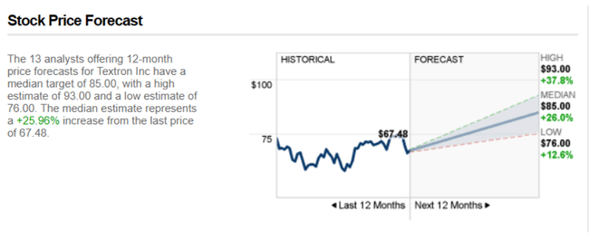 Die 13 Analysten, die 12-monatige Kursprognosen für Textron Inc. abgeben, haben ein mittleres Ziel von 85,00, mit einer hohen Schätzung von 93,00 und einer niedrigen Schätzung von 76,00. Die mittlere Schätzung entspricht einem Anstieg von +25,96% gegenüber dem letzten Kurs von 67,48.