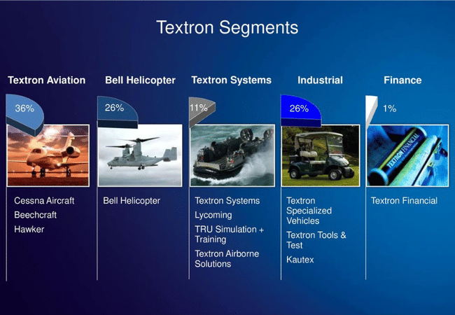 Textron ist ein amerikanischer multinationaler Mischkonzern, der eine breite Palette von Produkten und Dienstleistungen in einer Vielzahl von Branchen herstellt und verkauft, darunter Luft- und Raumfahrt, Verteidigung, Waffen, Automobil und Umwelt.