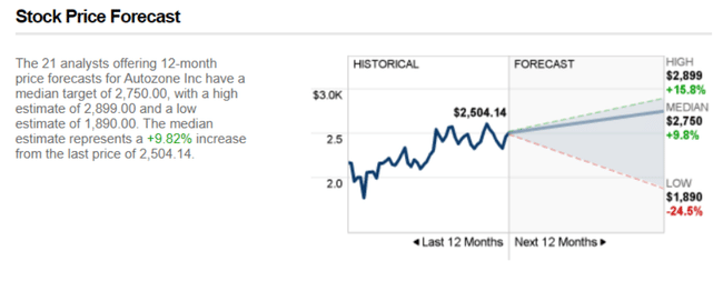 Die 21 Analysten, die 12-monatige Kursprognosen für Autozone Inc. abgeben, haben ein mittleres Ziel von 2.750,00, mit einer hohen Schätzung von 2.899,00 und einer niedrigen Schätzung von 1.890,00. Die mittlere Schätzung entspricht einem Anstieg von +9,82% gegenüber dem letzten Kurs von 2.504,14.